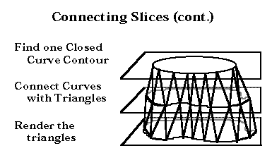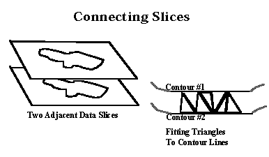 Contour Connecting is an object-ordered Surface Fitting method. Given a threshold value, a closed contour is traced for each data slice and then the contours in adjacent slices are connected and a tesselation, usually of triangles, is performed.