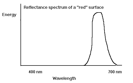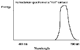 Incoming light interacts with a surface and may be absorbed, refelected, and/or transmitted. Materials have a reflectance spectrum which is a function of the angle of incidence of the incoming light. The color of an object is a function of the color spectrum of the incident light and the reflectance spectrum of the object surface. For example, if an object absorbed all the light except for red then the object would appear to be red in a white light. So the reflectance spectrum of a "red" object would look like this: