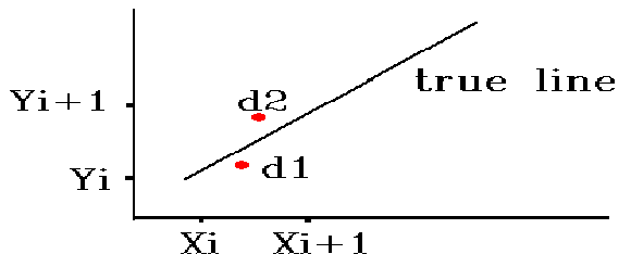 In this method, developed by Jack Bresenham, we look at just the center of the pixels. We determine d1 and d2 which is the "error", i.e., the difference from the " true line."