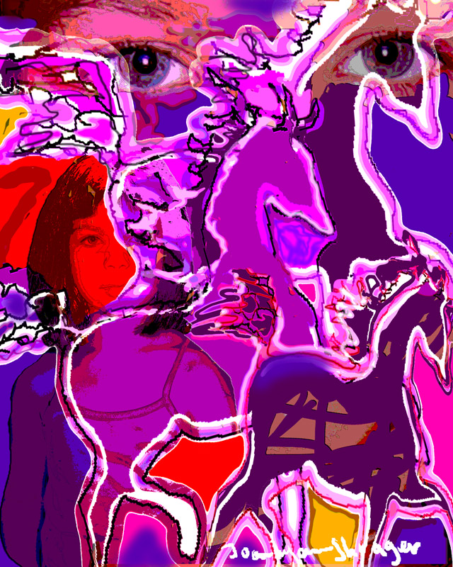 I got a computer in 1993 and began to fool around with the simple paint program that came with it. Graduating to Adobe Illustrator and Photoshop, using Wacom Tablet and Stylus my paintings are created exclusively on the computer. I also use a scanner for photos incorporated into the work. Additionally my equipment includes a digital camera and 2 printers, one a wide format.