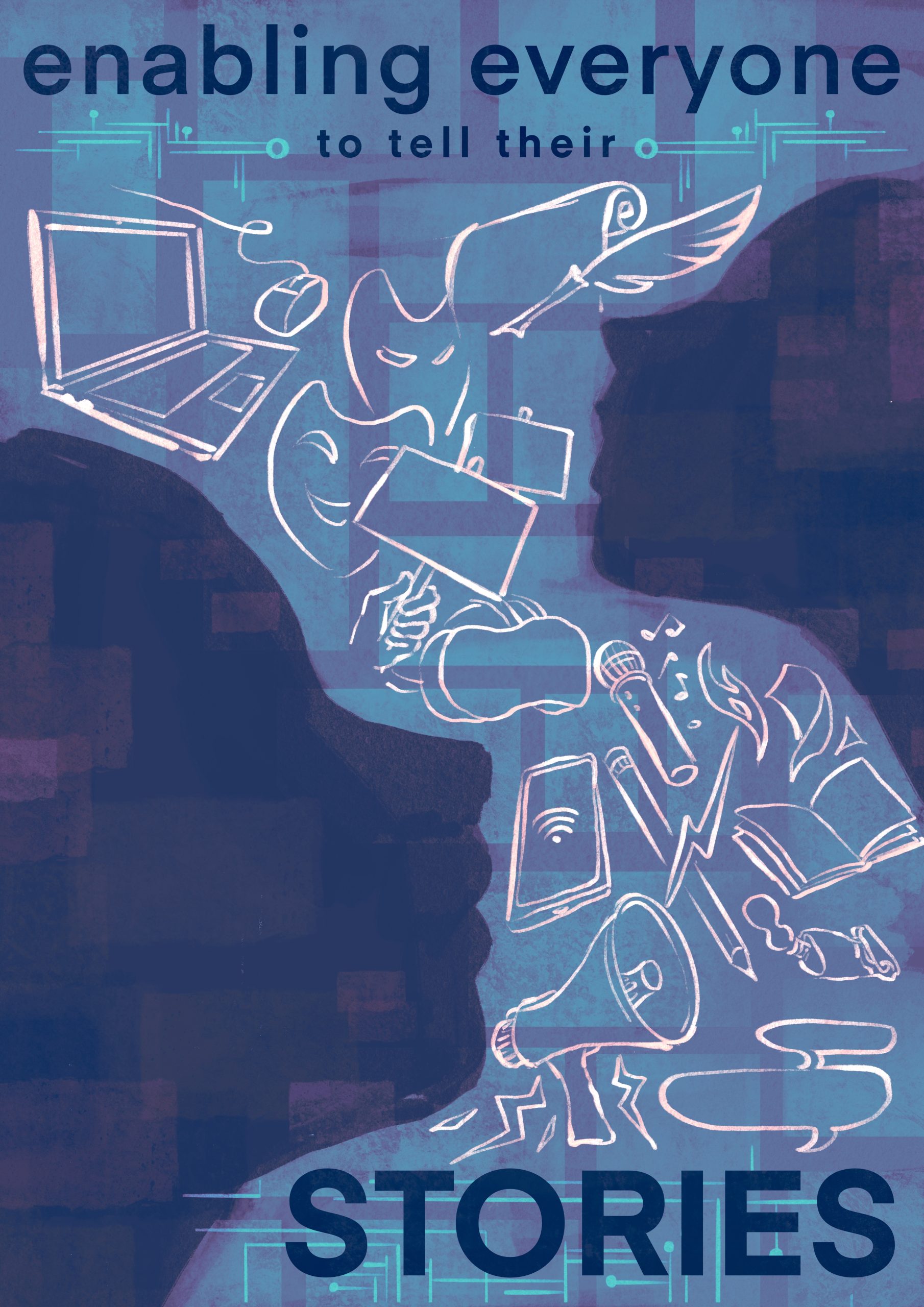Artist’s Statement: Trying to represent the scope of humanity and the ways that it has found to express itself over the years is challenging. Now with the many cries for social change, I thought that keeping the figures ambiguous would let the viewer decide who they see in the poster. Storytelling should be something that anyone can enjoy or take part in and I felt that filling in the gaps between the two figures with the many ways an individual can share their voice could represent how there is never a shortage of stories or opportunities to tell one and connect and empathize with others.