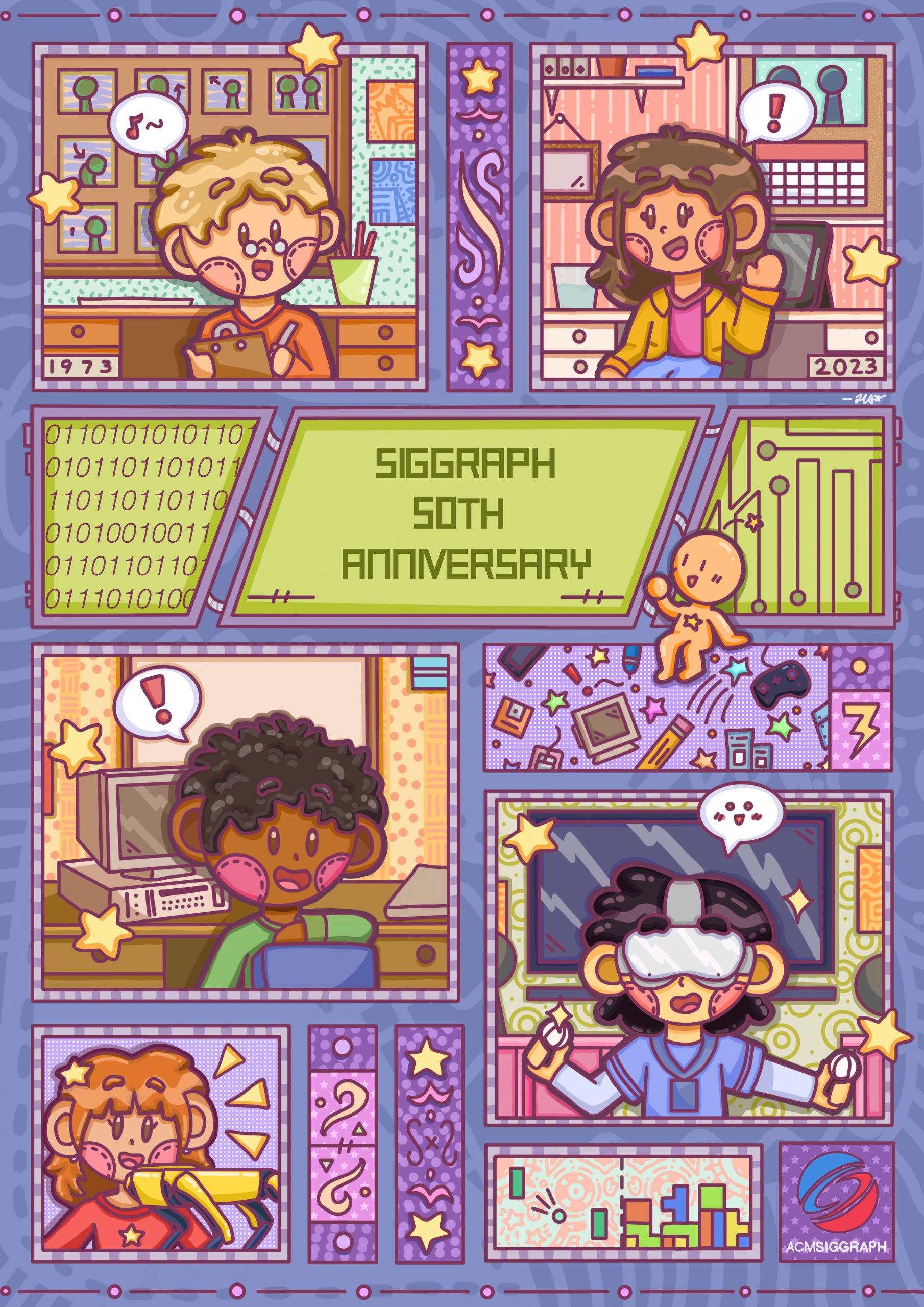 Technical Statement: My poster design uses the apps of the Sketchbook IOS app and Photoshop for the final edits of the digital work. The idea for this poster comes from the theme of celebrating the 50th anniversary of SIGGRAPH and I wanted to connect a storytelling element to it. I design the layout in a comic-book style with the main characters of the piece interacting with each other. On the left side are characters that are from the beginning of the technology that on the right shows the advancements it has made in computer graphics and interactive techniques throughout the 50 years SIGGRAPH has been in session. Through the vibrant colors and elements added throughout the design, it gives the viewer more of an insight into some of the advancements technology has progressed through such as how animation advanced but also video games/virtual reality.